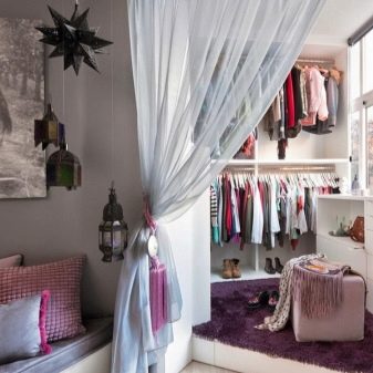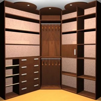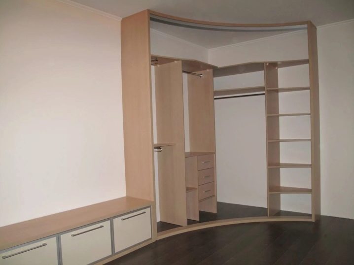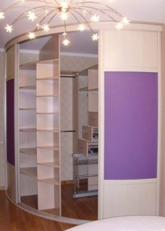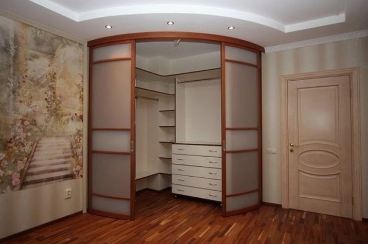 Можете да опростите работата по инсталирането на стени и запълването на такава стая, като закупите готов гардероб. Представени са ъглови модели, които съдържат решетки за костюми и връхни дрехи, рафтове и чекмеджета. Те нямат външен дял, но лесно можете сами да инсталирате полукръг корниз и да окачите на него красиви завеси. И ако положите усилия и направите заоблен контур, тогава в бъдеще върху него се монтира полукръгла стена от пластмаса, гипсокартон или полиуретан с всеки избран декор. Вместо сложна система за врати с водачи, можете да подредите стените с отвор, който е окачен с малка завеса.