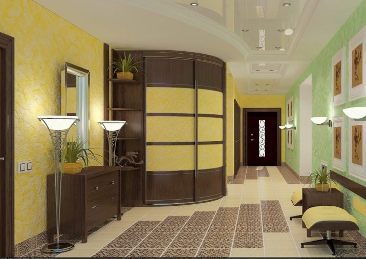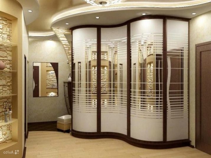 В хола полукръгла ъглова съблекалня с плъзгащи се врати на ролкови водачи ще изглежда най -представителна. Той се вписва добре във всеки интериор и за да се комбинира с цветовете на стаята, е възможно да се вземат съветващи строителни материали. Помещенията с 2 м страни са достатъчни за удобно използване.