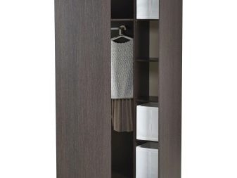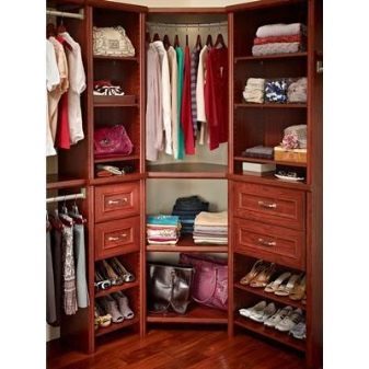 Проблемът с оптималното подреждане на ъглова полукръгла съблекалня се решава от готови мебелни комплекти, които се продават. Те са специално проектирани за максимален капацитет на дрехи и аксесоари на малка площ. В същото време в крайна сметка все още има място да се облечете свободно и да се погледнете в огледалото..