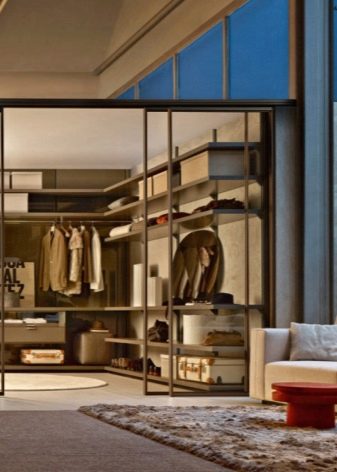 Има проекти за ъглови гардероби, които не достигат до тавана. Те опростяват монтажните работи и внасят допълнителна вентилация вътре. Ако искате да осигурите звукоизолация на тази стая, тогава можете да оборудвате стените в пълна височина в съседство с тавана. Монтажът на прегради и врати може да бъде направен от прозрачни материали, след което светлината ще проникне в съблекалнята отвън и няма нужда да инсталирате ненужни източници на светлина.