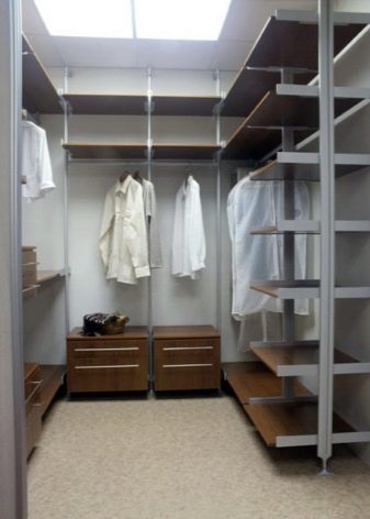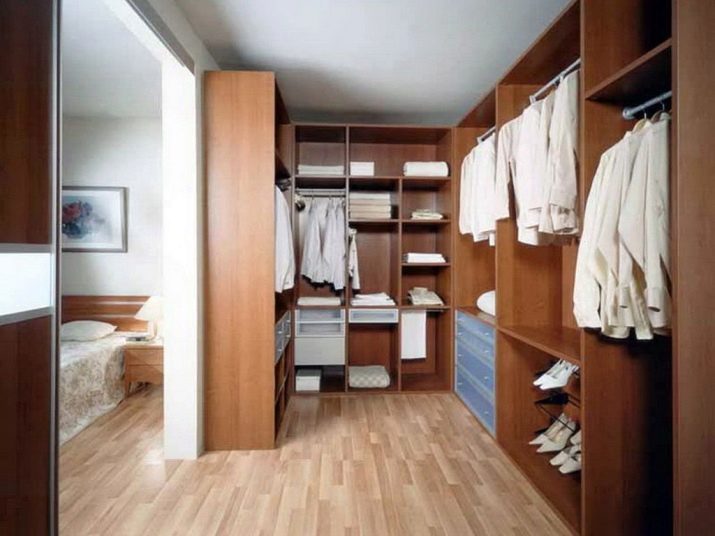 Тази опция е подходяща както за гардероб, вграден в ниша, така и за съблекалня от затворен тип. За изпълнението на такава опция може да се наложи от 3 или повече квадратни метра. Съблекалнята с U-образна форма се характеризира с наличието на осветление и всякакви предмети за съхранение на вещи.