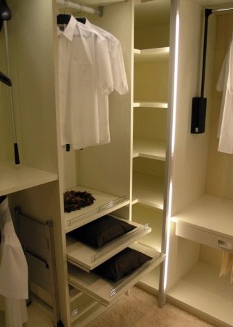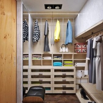 Основното правило при оборудването на съблекалня в малка стая е да се създаде вентилация. Ако това не се вземе предвид, тогава дрехите могат не само да се напоят с мухъл, но и да се навлажнят. Трябва да запомните и за осветлението..