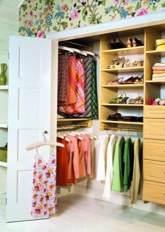 По -добре е да не разрушавате стените, тъй като килерът е идеален за ролята на съблекалня. Ако премахнете от него целия ненужен боклук, който обикновено се съхранява там в продължение на много години, тогава е напълно възможно да се установи, че там има много място. Няма да е излишно да извършите малък козметичен ремонт – ако е необходимо. Няма да е добре, ако старата мазилка се разпада и оцветява нещата..
