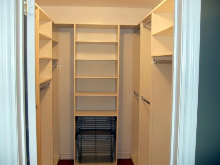 Решението за оборудване на съблекалня в килера е взето, което означава, че можете спокойно да вземете молив и да начертаете диаграма как ще изглежда всичко в крайна сметка. Обикновено складовото помещение в стандартните апартаменти е + 3 или + 2 квадратни метра към общата площ. Поставянето на мебели на толкова малка площ няма да работи, но е напълно възможно внимателно да подредите всички дрехи и обувки..