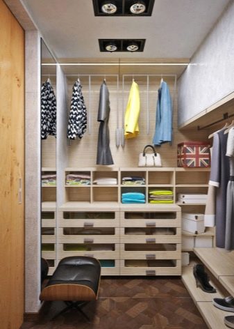 Интериорът на гардероба вътре може да бъде всичко, в зависимост от вашите лични предпочитания. Но много дизайнери, които правят това професионално, съветват да допълнят вътрешното пространство с огледала. Това не само ще направи съблекалнята визуално по -широка, но и ще улесни процеса на избор на подходящ тоалет – постоянно ще виждате отражението си, което означава, че ще ви бъде по -лесно да изберете подходящи опции за облекло..
