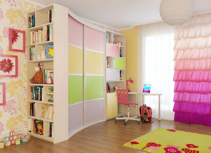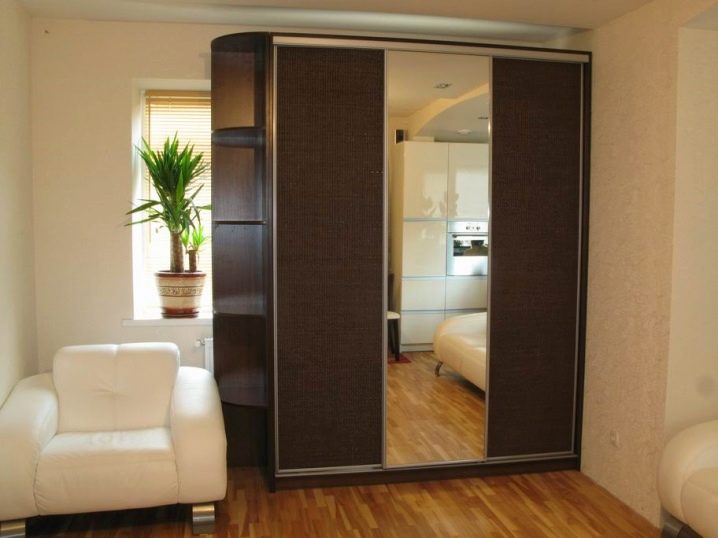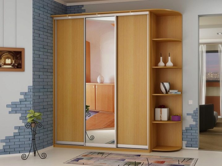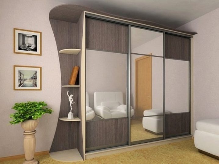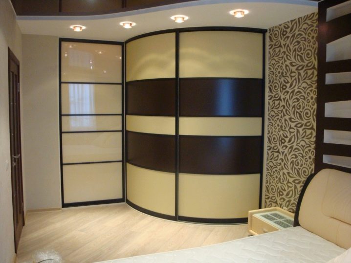 Разнообразие от модели ще бъде кръгъл или със заоблен гардероб, ако конструкцията не е монтирана в ниша, а по протежение на стената на спалня или хол. За да стане пространството лаконично, страничната стена на гардероба е закръглена – такава композиция изглежда приятна и безопасна в дизайна си: изключва се възможността да се удари остър ъгъл.