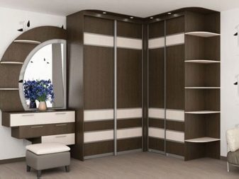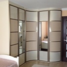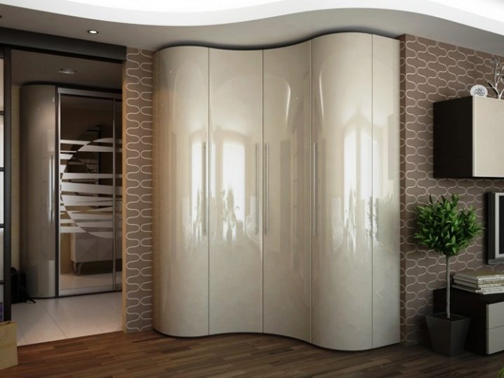 Разнообразие от модели ще бъде кръгъл или със заоблен гардероб, ако конструкцията не е монтирана в ниша, а по протежение на стената на спалня или хол. За да стане пространството лаконично, страничната стена на гардероба е закръглена – такава композиция изглежда приятна и безопасна в дизайна си: изключва се възможността да се удари остър ъгъл.