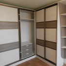 Оригинално решение би било да инсталирате гардероб в ниша или ъгъл на стая – спалня, която се превръща във функционално пространство не само за отдих, но и за съхранение на вещи. Тази идея често се използва в голяма площ, когато се изисква да “разтоварите” останалата част от апартамента или къщата от обемисти конструкции. Плъзгащият се гардероб в ъгъла действа като своеобразна съблекалня, която може да бъде маскирана с необичайно решение при довършването на външната му част – дизайнерът реши да добави структурата от дърво и матирано стъкло в комбинация с масив (за рафтове). Фигура 2