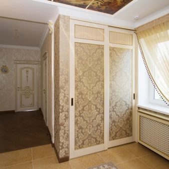 Малко по -рядко се срещат плъзгащи гардероби с вложки от ратан и естествена или изкуствена кожа. Такива шкафове изглеждат доста оригинални..