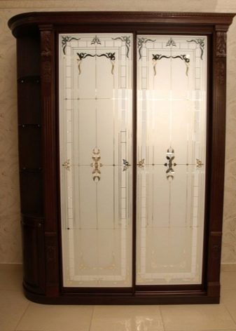 След определяне на външния вид, формата, както и вътрешното запълване и цвета на шкафа, започва една от най -трудните процедури по избор. Доста е трудно да се избере един вариант на декор от многото представени, тъй като всеки е добър по свой начин. Някои хора предпочитат да комбинират няколко опции, когато най -накрая не могат да решат коя им харесва. Гардеробите също са декорирани доста сдържано, но в същото време много красиво, за да подчертаят богатството и красотата на тази стилова посока..