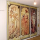 Плъзгащите се гардероби с фотопечат върху фасадата или шарка също изглеждат много хубаво, а ако са вградени в стената, приличат на част от стената, украсена с голяма картина. Но плъзгащите се гардероби с декорация под формата на стенописи изглеждат много по -красиви и класически. Рисунки с библейски, гръцки и други мотиви в стила на Рафаел, Рубенс, Микеланджело и други гении от Средновековието изглеждат невероятно красиви и внасят допълнителен комфорт, красота и класически дух в стаята.