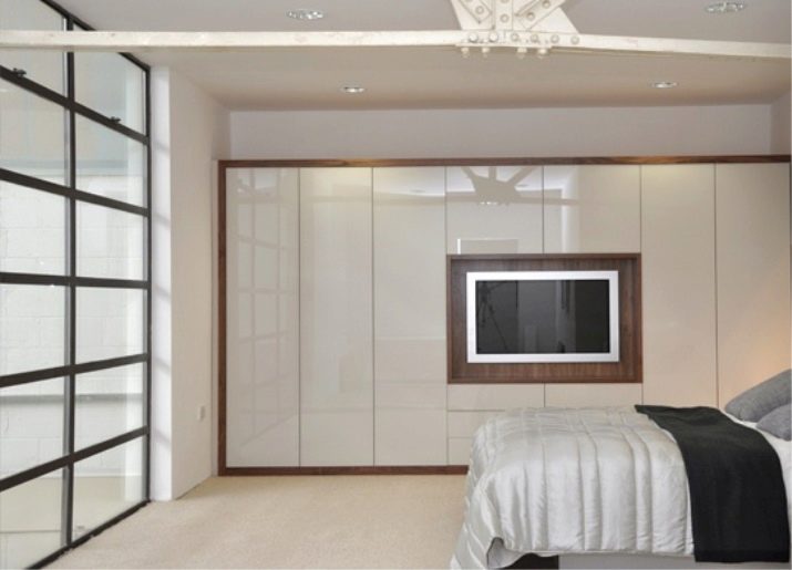 Можете да поставите телевизор в нишата на гардероба или да го използвате като рафт, на който има различни фигурки и необичайни фигури. Много собственици на апартаменти инсталират прожектори или осветяват ниша по периметъра. Шкафове с подобна декорация придават на стаята уютно и романтично настроение..