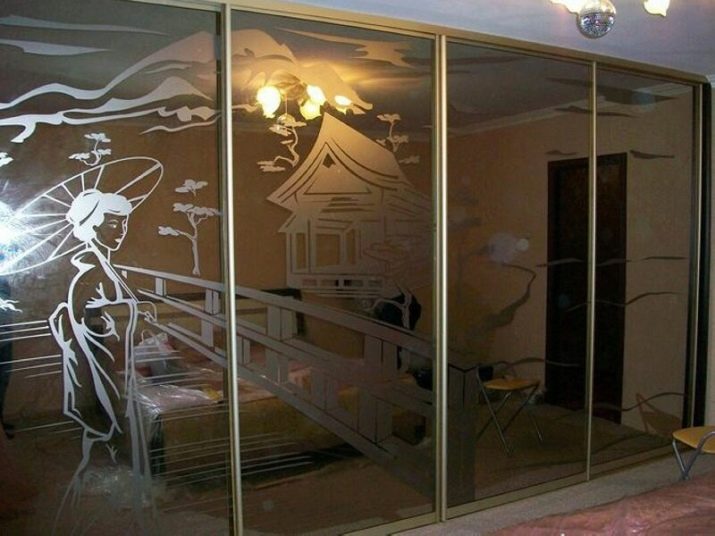 Можете да поставите такова изкуство не само върху гардероб, но и върху отделно огледало, тоалетка и други мебели с прозрачни повърхности. Изисканите матови изображения могат да бъдат прости, строги. Фентъзи теми, оригинални модели на национални теми, ориенталски мотиви и т.н. изглеждат страхотно върху стъклото.. Също така ще можете да изобразите истинска сюжетна линия, която ще добави аромат към интериора на класическия, авангарден, ретро стил. Създайте истинска илюзия, която увеличава визуалното пространство, внася специално настроение в цялостната атмосфера на стаята.