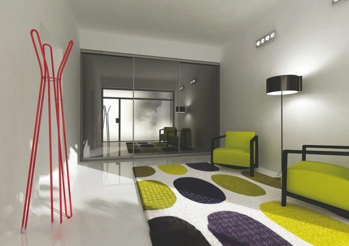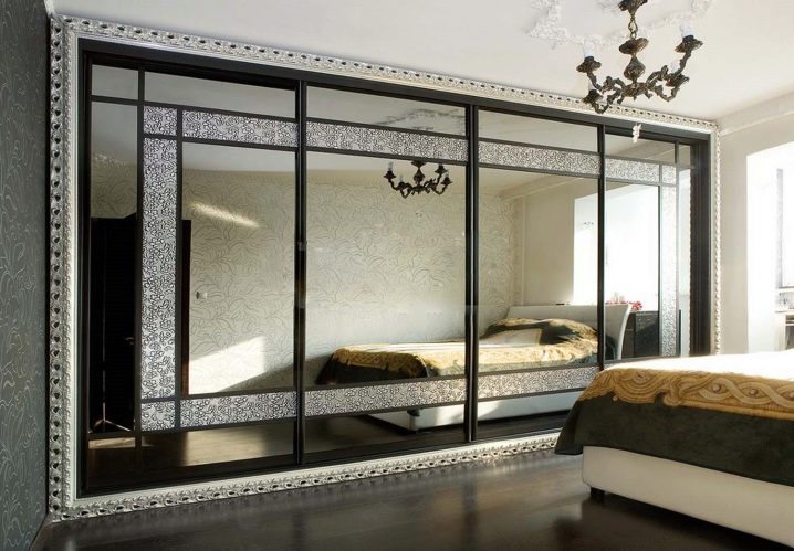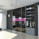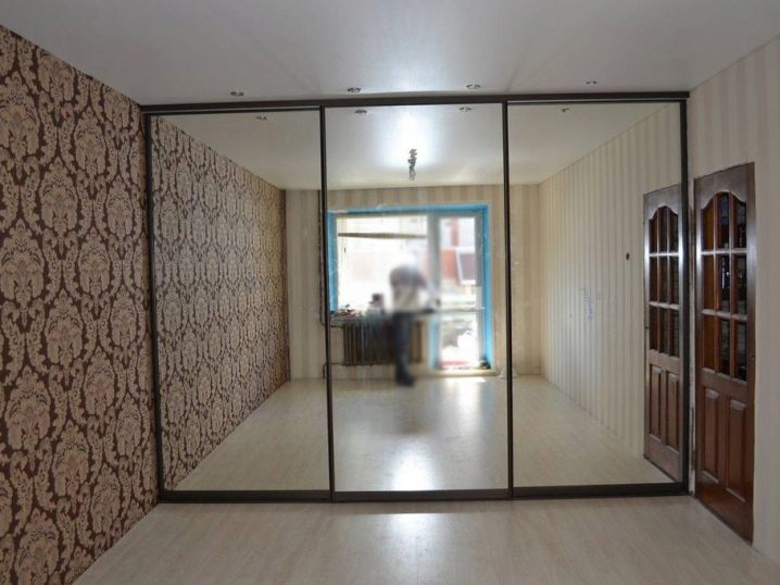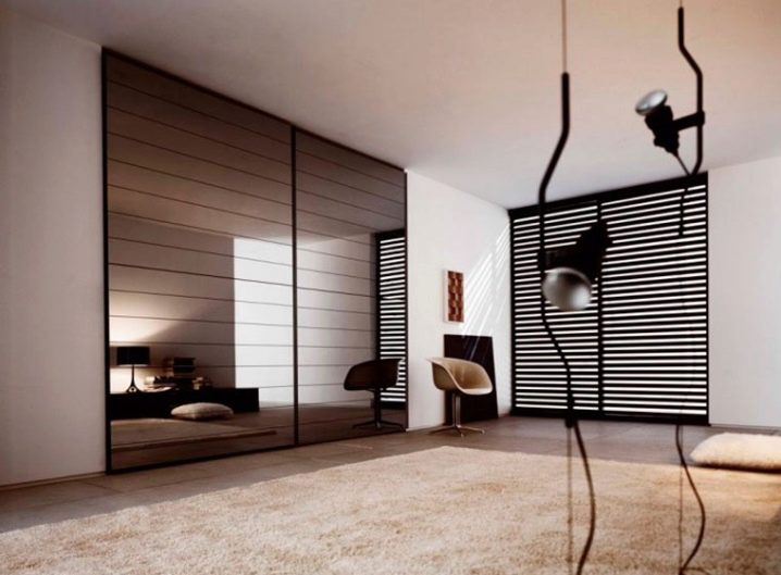 - Огледалата в предната част на гардероба до цялата стена и до тавана визуално ще разширят пространството; дървената текстура ще действа като екологично чист и стилен елемент на интериора (особено бамбук или ратан); лъскавата стъклена повърхност ще придаде на интериора модерен вид, а металът ще действа като идеален съюзник при въплъщението на нетипични дизайнерски идеи.