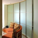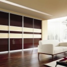 Когато инсталирате плъзгащ се гардероб в хола, трябва да се обърне специално внимание на дизайна на фасадите му: разнообразете ги с огледала, ако стаята не е много просторна, дайте предпочитание на бамбукови покрития, лъскаво стъкло или матов аналог, за да придадете модерен дизайн, а за класика изберете масивна дървесина – това ще даде пространство на шик.