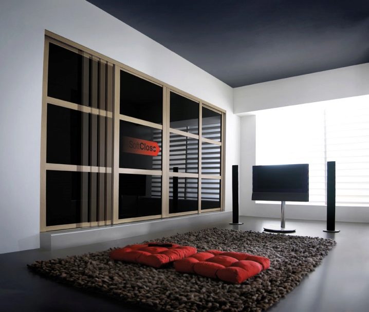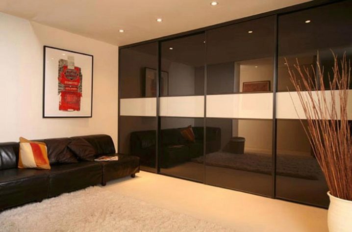 Огледалото може да играе функционална и декоративна роля едновременно, ако го направите потъмнено; такъв гардероб е подходящ за зала – стая, където обикновено се събират гости и цялото семейство.