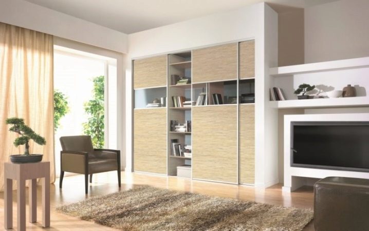 Плъзгащата се библиотека е идеална за всекидневна, където е важно да се осигури възможност за добра почивка. Комбинирайте затворени фасади с отворени рафтове – това ще създаде ненатрапчив дизайн на шкафа и в същото време забележимото му изображение.