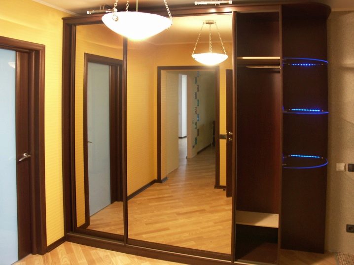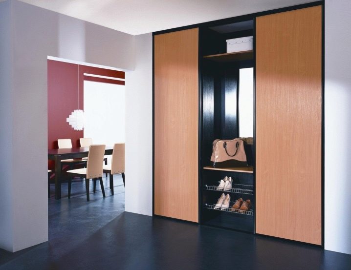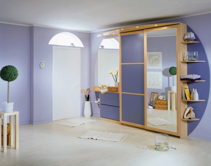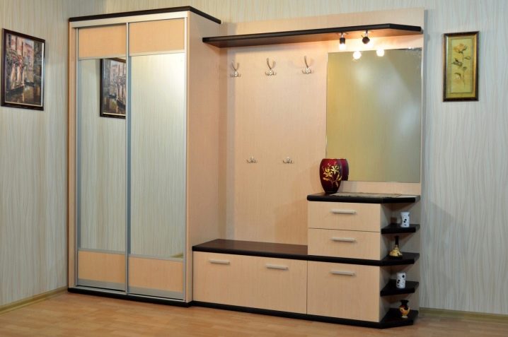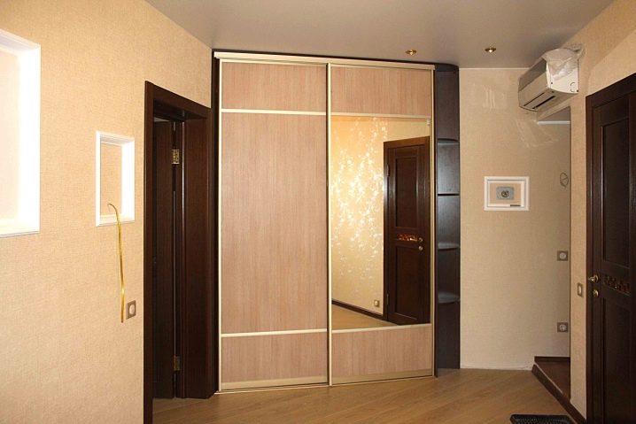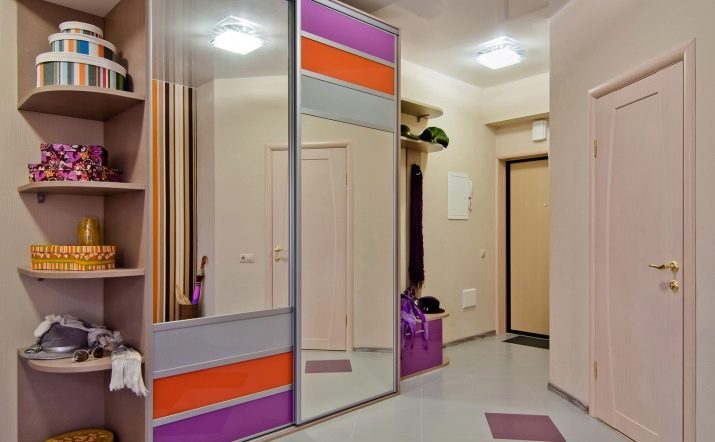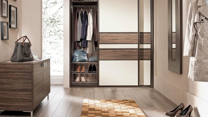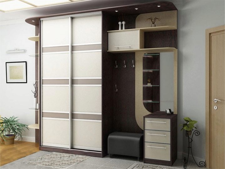 Компактен и многофункционален гардероб – отделение със сигурност ще реши проблема ви с разпръснати неща. Особеността на тази версия на шкафа е, че той е отлична алтернатива на големи и обемисти шкафове. В допълнение, той не заема много място, тъй като най -често е вграден. Също така гардеробът има плъзгащи се врати, които също заемат минимално място в коридора. За предпочитане е да изберете такъв шкаф с огледала, така че да можете визуално да увеличите размера дори на малка стая..