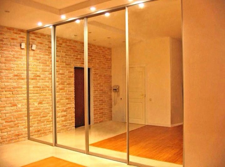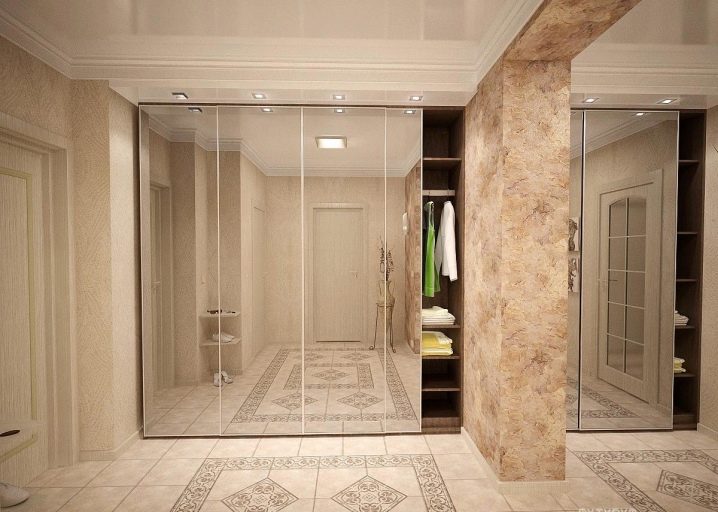 Ако гардеробът ви е оборудван с огледала, тогава можете да разнообразите дизайна с помощта на осветление на козирката или под нея. Използването на халогенни крушки е много удобно и практично.