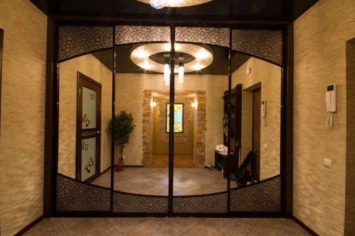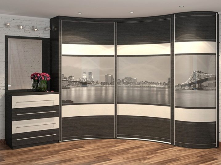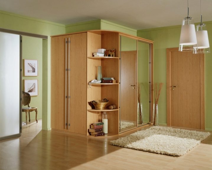 - Радиални гардероби – отделения могат да бъдат объркани с ъглови модели, но основната им отличителна черта е, че вратите не се движат по права линия, а описват радиуса на кръг. Такива шкафове винаги изглеждат скъпи и луксозни, тъй като най -често са изработени от скъпи материали. Такъв гардероб перфектно ще украси дори малък коридор и много добре ще разнообрази и дори ще украси вашия интериор. Недостатъкът на дизайна на този шкаф е, че на него не могат да се монтират огледала, но всъщност това не е проблем. Тъй като така или иначе шкафовете изглеждат прекрасно.