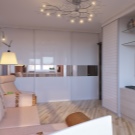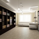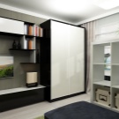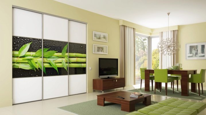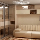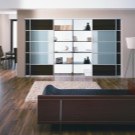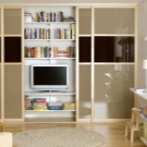 Малък модел е подходящ за всекидневна в хай-тек или еко стил. Последното ще изисква светли цветове, естествени материали и повече растителност. В цветовата палитра гардеробът може да се пресича с рафтове, рафтове и нощни шкафчета; за единството на интериора, подът и таванът се правят най -добре в бяло или светло бежово. За стени е подходящ тъмно бежов или наситен сив цвят. Зелените детайли могат да бъдат под формата на възглавници, саксии на перваза на прозореца, картини.