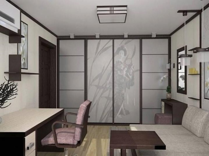 Ориенталският стил на хола ще допълни гардероба с японски мотиви. Вратите могат да бъдат стилизирани като вътрешни прегради, които се използват в японски къщи. Калиграфия, вишневи цветове или красива гейша – всеки дизайн може да бъде приложен към мебели. В същото време всекидневната може да бъде направена както в спокойни сиви тонове, така и в ярки огнени..