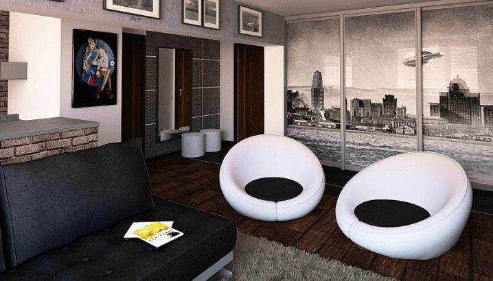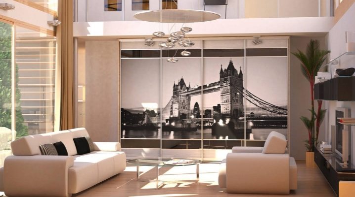 Гардероб за всекидневна в стил таванско помещение трябва да се отличава с характеристиките на тази посока на дизайн. Мебелите не трябва да затрупват пространството. Стилът на таванско помещение е изборът на творчески и необикновени личности, така че гардеробът трябва да бъде необичаен. Това може да бъде вградена структура, изобразяваща градски пейзаж. Черно -бялото изображение ще добави цвят.