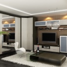Всекидневната в апартамент или къща обикновено е доста просторна, така че можете да изберете просторен гардероб с отворени рафтове за оборудване – телевизор, музикална система. Сувенири от далечни страни и семейни снимки ще паснат идеално тук. Това ще направи хола по -удобен, ще допълни декора на стаята..