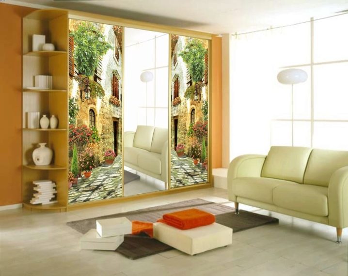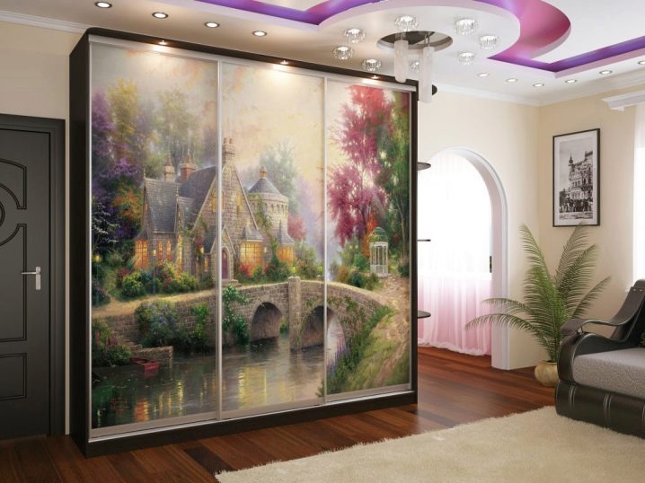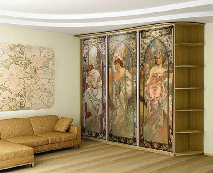 Гардероб с ярка стенопис ще изглежда много елегантен, великолепен и скъп в хола. Този модел е подходящ за барокова стая. Вратите могат да бъдат боядисани от известни художници. Така че не само ще украсите интериора, но и ще се присъедините към красотата. Плъзгащият се гардероб може да бъде украсен със стенописи по произведенията на чешкия художник Алфонс Муха. Ето три красиви замислени моми.