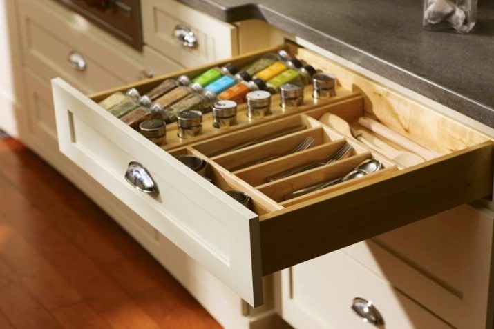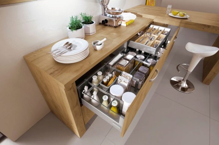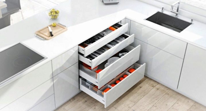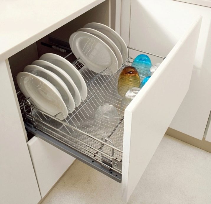 Използването на такива системи ви позволява да използвате всеки сантиметър в кухнята за определена цел. Шкафовете са доста просторни, някои от тях са предназначени за съхранение не само на съдове, но и на кухненско оборудване, домакински уреди.