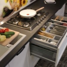 Функционалните кухни включват използване на максимално количество пространство с помощта на такива издърпващи се конструкции. Най -просторните секции са подредени близо до печката, в която лесно можете да съхранявате прибори за готвене..