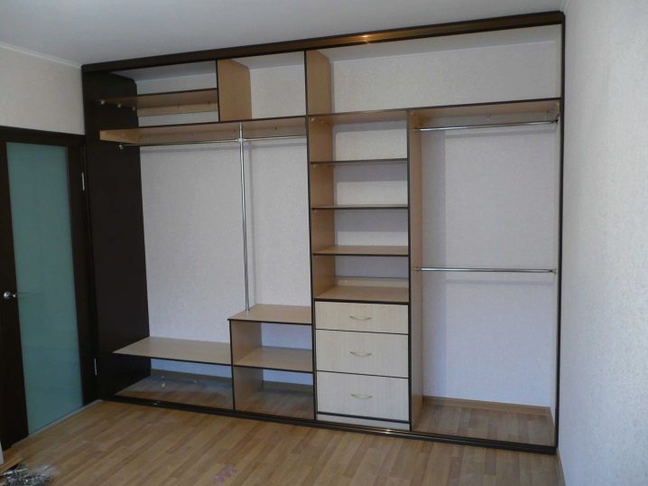 Ако гардеробът има малки размери, например 3 врати по дължина, тогава можете да инсталирате една надлъжна лента на 2/3, където можете да окачите всички връхни дрехи на закачалките. Използвайте останалото за чекмеджета и оставете малко място отгоре за отворени рафтове. Отдолу, в пълна дължина, можете да организирате отделение за обувки, което е отделено от основното пространство с хоризонтален рафт.
