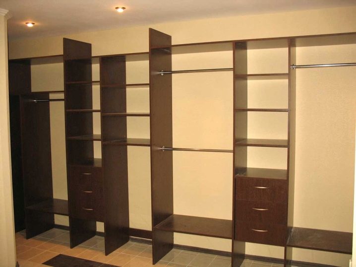 Готовият модел е 4-стенен гардероб. Тя може да бъде позиционирана в цялата стая, след което ще раздели стаята, изпълнявайки функцията за зониране. И ако го поставите близо до стената, тогава дрехите ще имат допълнителна защита от студ и влага..