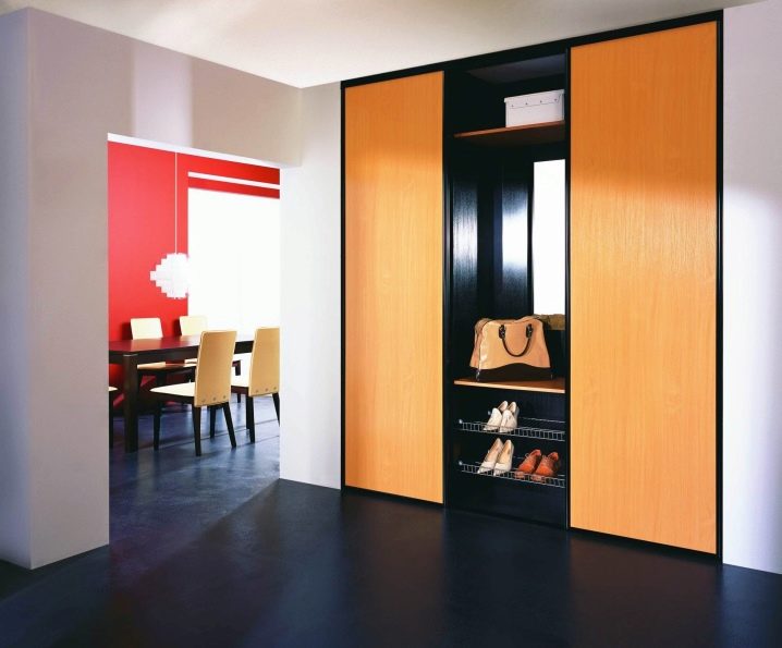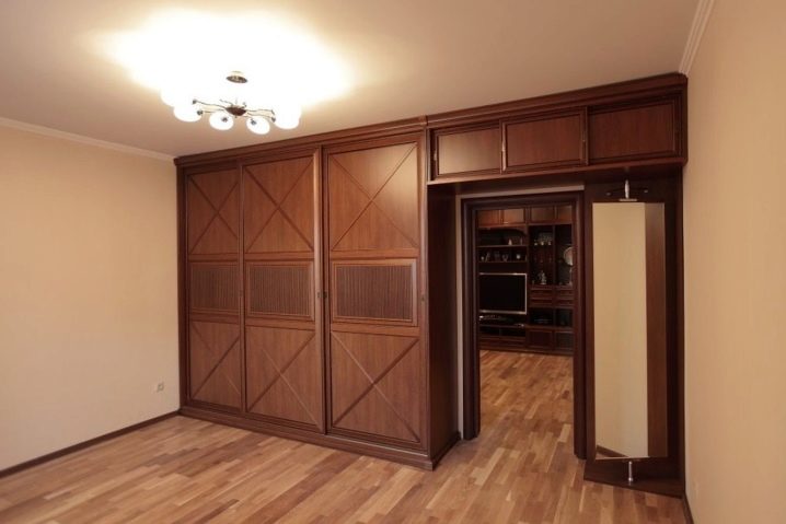 Подобна опция може да се използва с ниша с пълна стена, като се използват съществуващи подове във всяка стая. Те ще изпълняват функцията на три стени на шкафа, четвъртата с подвижни врати ще трябва да се монтира независимо. Такива модели могат да бъдат инсталирани в спалнята, в детската стая, в залата. Предимството е, че всички дрехи са под ръка, в хола, а недостатъкът е, че такъв дизайн отнема използваемата площ на стаята..
