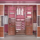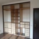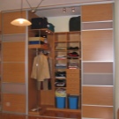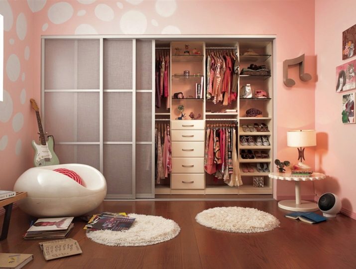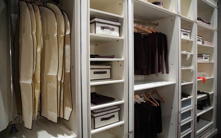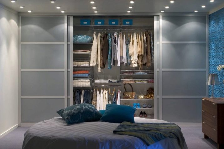 В по -просторни модели гардероби – цялата стена на спалнята или големи ъглови, можете да направите няколко реда рафтове, отделни хоризонтални решетки за лятно и зимно облекло, отделение за панталон и отворени рафтове на пълна височина. Можете дори да намерите място за вътрешно огледало и да изпробвате тоалети пред него. Тогава вграденият гардероб може да се превърне в пълноценна изолирана съблекалня..