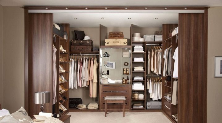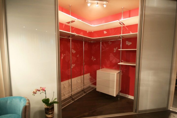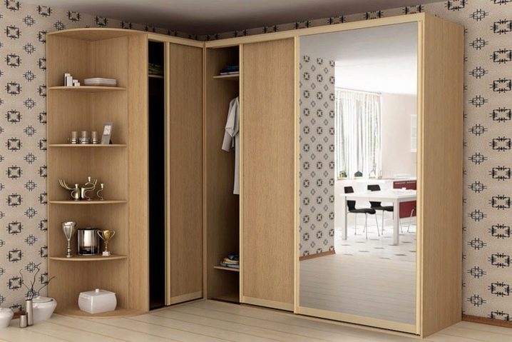 В малки апартаменти, за да спестите място в стаята, можете сами да монтирате ъглов гардероб. В профил той ще има триъгълна форма, две съществуващи стени на помещението и една трета ще бъде издигната – с плъзгаща се врата. Поради малкия си размер може да се използва само едно крило. Ако пространството на хола позволява, тогава мнозина изграждат ъглова версия с правоъгълна форма. Той вече има 2 собствени стени, повече вътрешно пространство, където можете да поставите пръти с закачалки, чекмеджета и рафтове.
