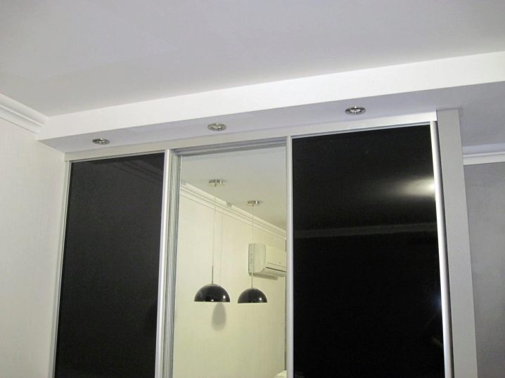 Ако всички части на корпуса на шкафа са направени независимо, тогава може да се предвиди специална издатина за горната част, простираща се извън равнината на вратите на крилата. В него се изрязват кръгли дупки и лампите се монтират там подред, 3-4 лампи са достатъчни за 1 метър дължина. Това създава модерен и стилен дизайн и ефективно осветява шкафа вътре. Този метод изисква допълнително прокарване на кабели от домакинската мрежа, но задачата може да бъде опростена, като се използват висящи лампи, захранвани от батерии. Осветлението може да се монтира и в ниша на шкафа, така че ще бъде по -удобно да се движите вътре, за да спестите енергия или енергия от батерията, можете да вградите сензори за докосване.
