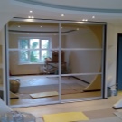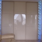 Плъзгащ се гардероб от гипсокартон със сложна структура по цялата стена.