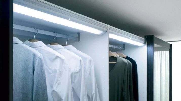 Осветлението за гардероб е най -добре избрано от LED прожектори. Те произвеждат равномерна и без трептене светлина, безпроблемни и издържат много по-дълго от обикновените крушки с нажежаема жичка. Те консумират ниска мощност, което спестява енергия, не отделят много топлина, така че околната повърхност не се влошава под тяхно влияние.