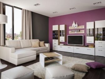 Понякога при проектирането на мебели се използват повече от два нюанса. Люляково, лилаво и, колкото и да е странно, жълто и оранжево работят добре с черно -бял комплект. Този многоцветен дизайн често се среща в модулни мебели в модерен стил..