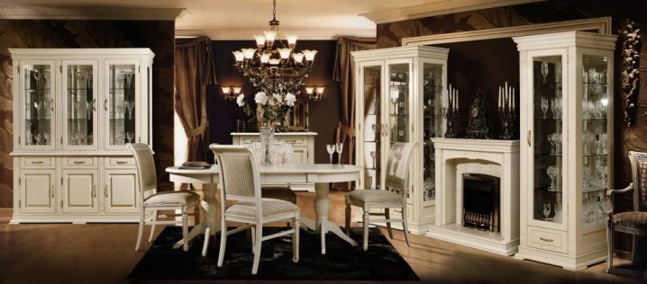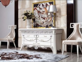 Бляскавото обзавеждане се характеризира с блясък, блясък, сложни довършителни елементи и скъпи материали. Ако това е мека мебел, то със сигурност от елитни материи като велур, кадифе или естествена кожа, ако гардеробът или скринът са от ценни дървесни видове.