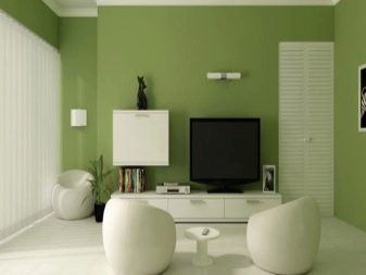 Известно е, че зеленото помага за облекчаване на стреса и успокоява. В комбинация с бяло, той се настройва към спокойно настроение. В такава всекидневна искате да се отпуснете и да се отпуснете след тежък ден..