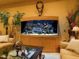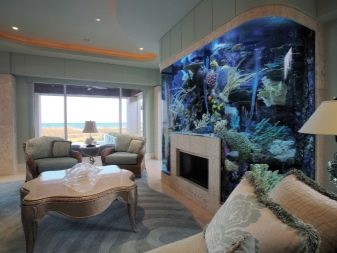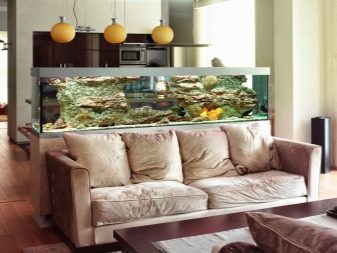 Аквариум с риби е добавен към интериора като нестандартен и ярък детайл. Такъв елемент със сигурност ще привлече вниманието на вашите гости. Спокойствие и релакс ще ви даде шумът на водата и гледката на плуващи риби. След като наблюдават тези същества, всички в стаята ще получат заряд от положителни емоции. В допълнение, наличието на аквариум ще осигури постоянно овлажняване на въздуха..