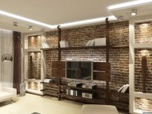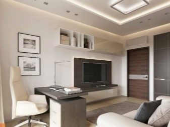 В малка стая можете да създадете зашеметяващ интериор, като в тази сладка стая. Всекидневната включва всичко необходимо: просторен диван, маса, телевизионна зона със секция. Стилният дизайн се допълва от окачени тавани и модерни тапети.