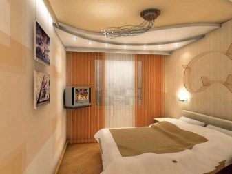 Препоръчително е да направите тавана за малка стая. Конструкция от гипсокартон с вградени прожектори изглежда добре в такова пространство. Ако повърхността е достатъчно равна, можете да направите без основа от гипсокартон: просто я изравнете с шпакловка, грундирайте я и я боядисайте в светъл тон. За стая от 16 кв. м, двустепенното таванно покритие с отделяне на функционални зони също е подходящо, ако височината на тавана позволява.