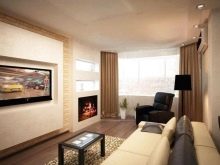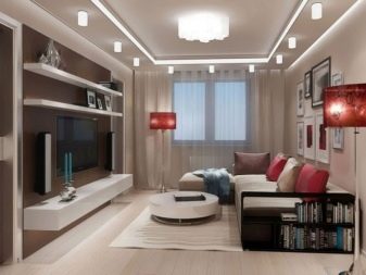 В малка правоъгълна стая с един вход е доста лесно да се направи оформлението на пълноценна всекидневна. Възможно е да комбинирате телевизионната зона със секция и други домакински уреди, като компактно подреждате всичко по по -дълга стена. Голям диван и фотьойли могат да бъдат поставени на противоположната вертикална равнина. Все още ще има много свободно място за масичка за кафе, подови лампи, нощни шкафчета.