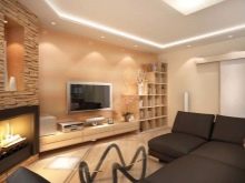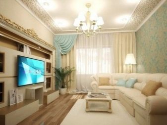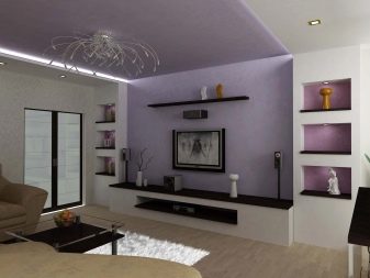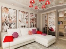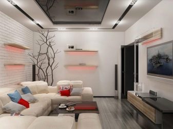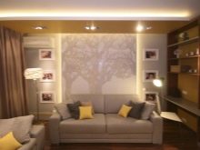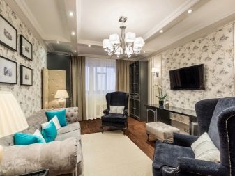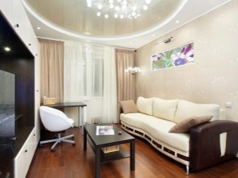 В малка стая можете да създадете зашеметяващ интериор, като в тази сладка стая. Всекидневната включва всичко необходимо: просторен диван, маса, телевизионна зона със секция. Стилният дизайн се допълва от окачени тавани и модерни тапети.