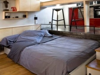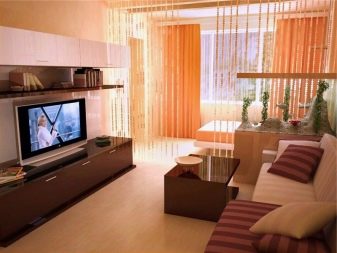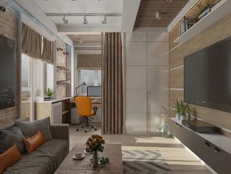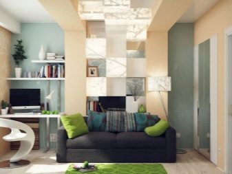 Ако имате нужда от работна зона, тя трябва да бъде компактна и универсална. Масата, чекмеджетата, рафтовете трябва да бъдат поставени на удобен достъп, така че да не заемат много място. По -добре е да откажете от стена с мецанин, гардероб и бюфет, към който сме свикнали. На тяхно място ще заемат конструкции от гипсокартон, телевизионни стойки или миниатюрни стени с преобладаваща декоративна функция..