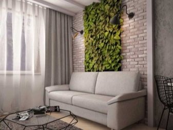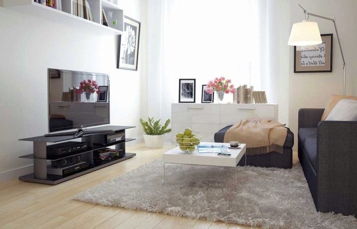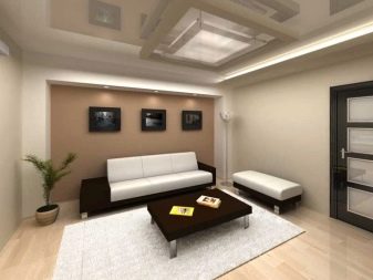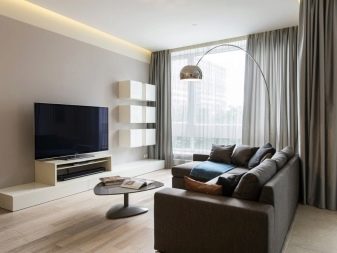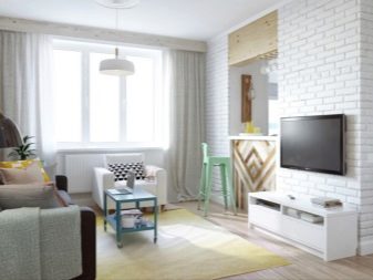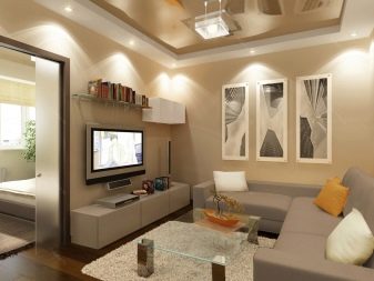 Минималното количество мебели, лаконични форми и прости цветове са идеалната възможност за дизайн за скромните размери на хола. Няма по -добър дизайн за младите хора. Допуска се бюджетно завършване в светли цветове, отсъствието на допълнителен декор е важно.