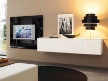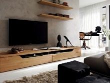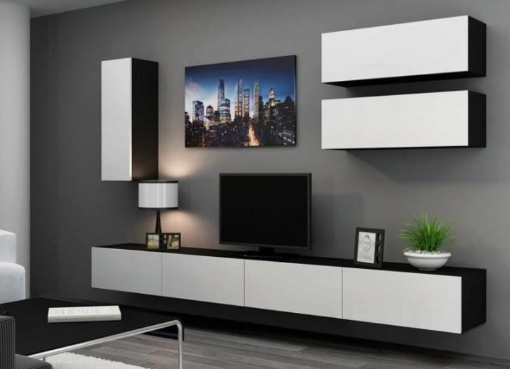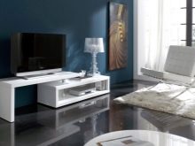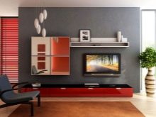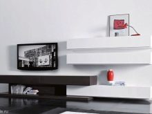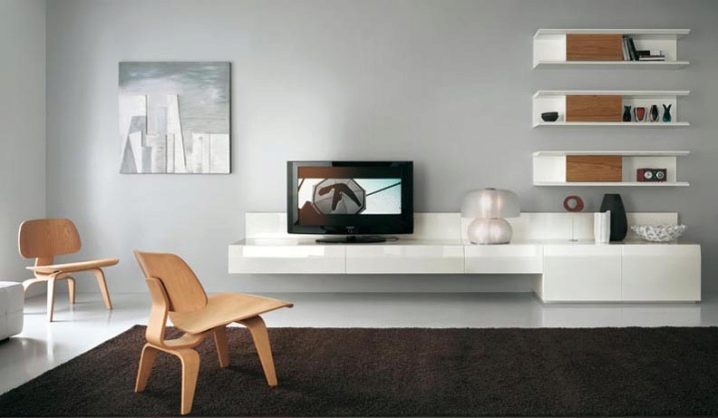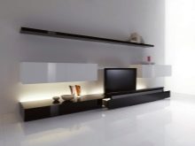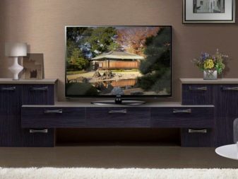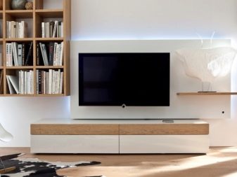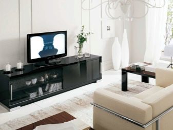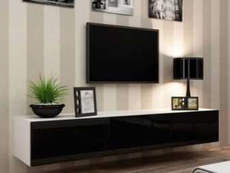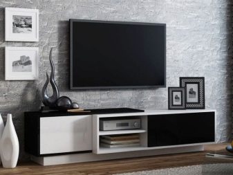 Има и много възможности за изработка на дълги нощни шкафчета в модерни стилове. Ако такъв обект е поставен по цялата дължина на стената, тогава Има два начина за монтиране на телевизора: